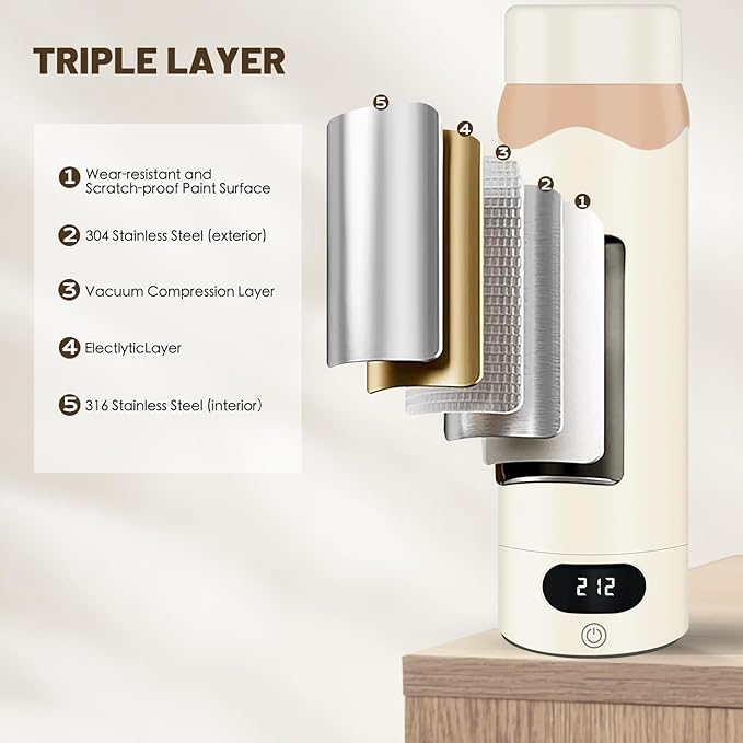 • Double Wall Food-Grad Stainless Steel: The personal portable electric kettle are made of food-grade 316 stainless steel inside, 304 stainless steel for the outside casing which build feels solid and safe to touch. 100% BPA free, provide you with personal healthy water. ( Note: Must be plugged in to work! )