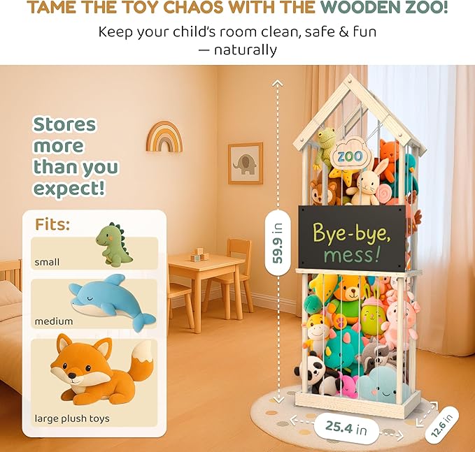 Extra Large Stuffed Animal Storage Zoo β Wooden Vertical Plush Toy Organizer & Storage with Built-in Chalkboard, 3 Chalks & Holder, Tool-Free Assembly, Anti-Tip Strap & Bumpers