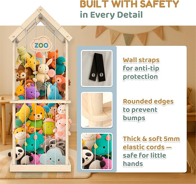 - π³ [PREMIUM WOOD DESIGN] Crafted from solid pine with smooth edges and rounded corners. This stuffed animal holder and plush toy organizer is built to last, protecting hands and walls from bumps.