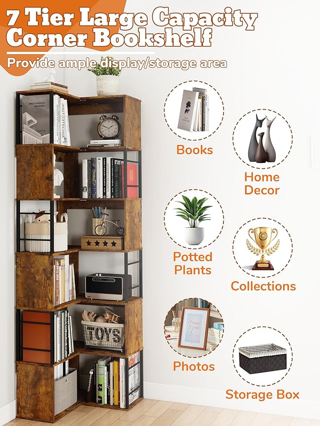- 【Spacious 7-Tier Corner Bookcase】With 7 tiers (11.82" height each), this 7-tier corner bookshelf offers generous storage (74"x21.6"x21.6"). Perfect for organizing books, plants, toys, and essentials in living rooms, offices, or bedrooms.