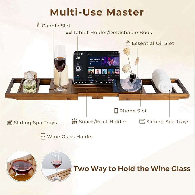 - 【User-Friendly Design】This luxurious bathtub tray comes with a flip-up stand for your book or tablet, plus holders for your wine glass, phone, and candles. There’s plenty of room for all your spa and bath essentials too. It adds a touch of luxury and convenience to your soak—everything you need, right within reach.