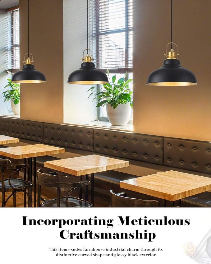 - 【NEWLY UPGRADED DESIGN】This pendant light is designed around a farmhouse concept, featuring an industrial shade. Newly upgraded gold lamp holder and gold interior, making the lighting fixtures more luxuriousExpertly made from solid metal and coated with a protective baking paint, it stands out for its remarkable durability. Its anti - rust properties and colorfastness ensure it remains a charming addition to any indoor decor.