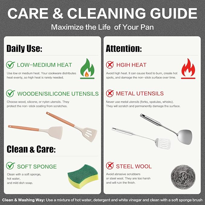 - 【Healthy Cooking, Happy Living-60% Less Oil & 100% Safe】 Cook smarter with our PFOA-free, non-toxic frying pan set that needs minimal oil. Fry bacon in its own fat, flip eggs without butter, or sear fish with just a spritz. Certified free of leadand cadmium, it's ideal for keto, low-calorie, and heart-healthy diets.