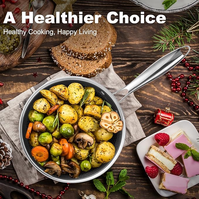 - 【Energy-Efficient Design-Cook Faster, Waste Less】 The tri-ply stainless steel with aluminum core heats twice as fast and retains heat longer, letting youcook crispy salmon or tender veggies on lower settings. Stainless steel cools quickly for safer handling, while even heat distribution reduces oil use by 30% for perfect browning every time.