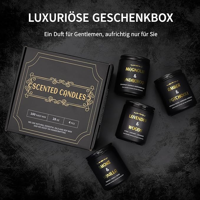 - 【Premium Candles for Men】Designed exclusively for men, this scented candles is carefully blended with 4 different scents: Lavender Wood, Amber Patchouli, Smoke Vanilla, and Sandalwood. Each scent is an olfactory work of art, reconstructed by international perfumers with the golden ratio of fragrance materials, and selected fragrances are scientifically matched to stimulate fragrance, effectively relieve stress, improve concentration, and bring a deep relaxation experience.