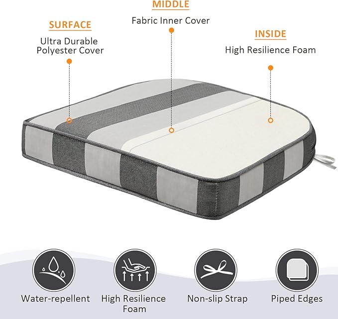 - 【Non-slip Ties and Piped Edge】 The two non-slip ties can be fastened to your furniture to keep the outdoor cushion in place. Some seams are finished with piping, which reinforces the edges and makes the outdoor furniture cushion more stylish.