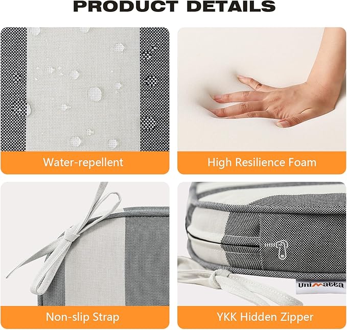 - 【High Resilience Foam】 The Unimatta chair cushions are filled with high-quality 100% foam, high-density sponge offers excellent support and long-lasing comfort. Whether you're enjoying a sunny afternoon or a cool evening, this cushion will keep you cozy.