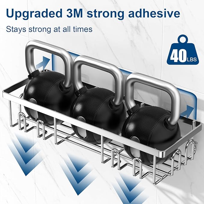 - 【Maintain Balance and Absolute Stability】- The newly upgraded 3M Clear No-Scratch Adhesive is ultra-reliable and can hold up to 40 pounds. Which is equal to 16 bottles of 35oz shampoo/ shower gel/ body lotion weight. Keep the tins and bottles in the bathroom shelf organizers, and make them easy to fetch and use. Never worry about falling issues after proper installation