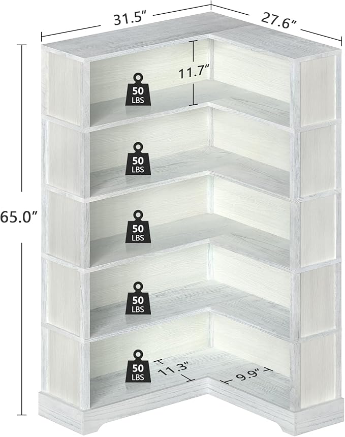 TVU Wood Corner Book Shelf, 5 Tier 65 Inch Tall Bookshelf with Storage, Floor Standing Display Book Shelf for Living Room, Kitchen, Home Office, Antique White