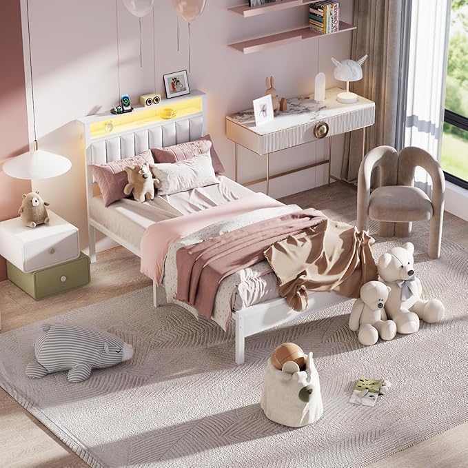 - Innovative Charging Station: Stay connected effortlessly with the integrated charging station in the headboard of this twin bedframe. 2 AC outlets + 2 USB ports power lamps, phones, and tablets. You can easily charge your devices while enjoying the convenience of a clean, clutter-free bedroom.