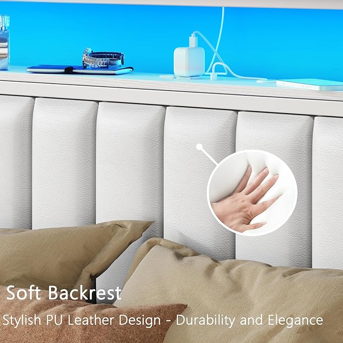 Furnulem Twin Size Bed Frame with Charging Station & LED Lights, Modern Platform Bed with 2-Tier Storage Shelves, White PU Leather Upholstered Headboard, No Box Spring Needed, Metal Slats Support