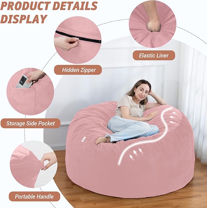 5FT Bean Bag Chair with Ultra Soft Velvet Cover Bean Bag Sofa with Memory Foam Bean Bag Chairs with Large Size Lazy Sofa for Dorm Office Living Room Bedroom Light Pink 5'