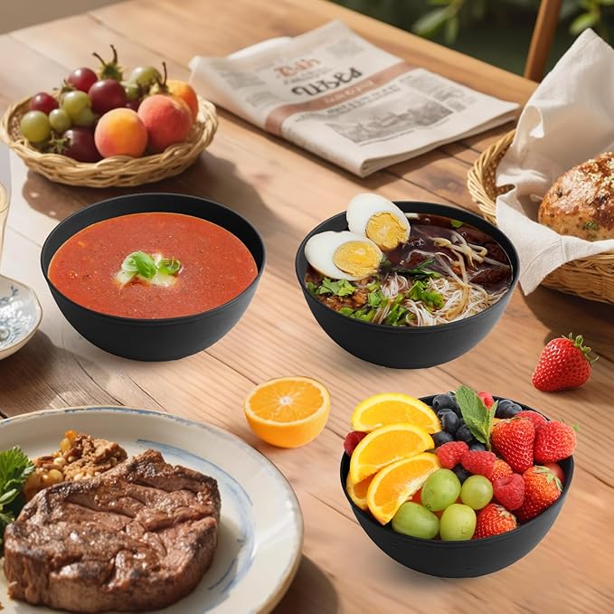 - GENEROUS CAPACITY & REINFORCED DESIGN: 40 oz black bowl offers generous capacity as a large soup bowl, large salad bowl for eating, or big plastic bowl. Thickened walls provide enhanced stability, making these large plastic bowls ideal serving bowls or mixing bowls for hearty meals, soups, salads, cereals, noodles, and dinner