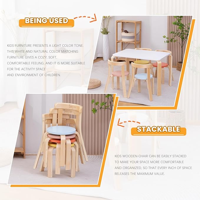 - Stackable Design - The 4-pieces toddler wooden chairs can be easily stackable to make the whole space more organized and comfortable. The toddler chair equipped with felt pads that are non-slip and protect floorsfrom scratching and scuffing.