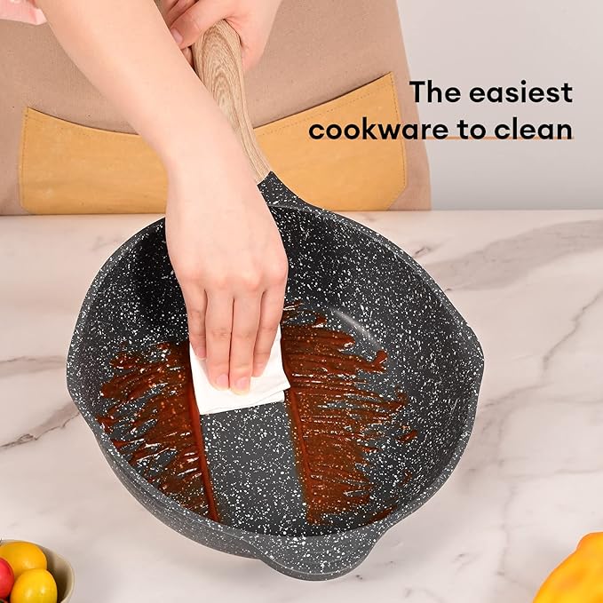 - 【EASY GENTLE AND EFFECTIVE CLEANING】 Upgraded non-stick coating, food is less likely to stick, omelettes and pancakes turn over easily, cleaning takes only a few seconds, wipe with warm water. We recommend deep conditioning with baking soda once a month to keep your pots and pans looking like new for a long time.