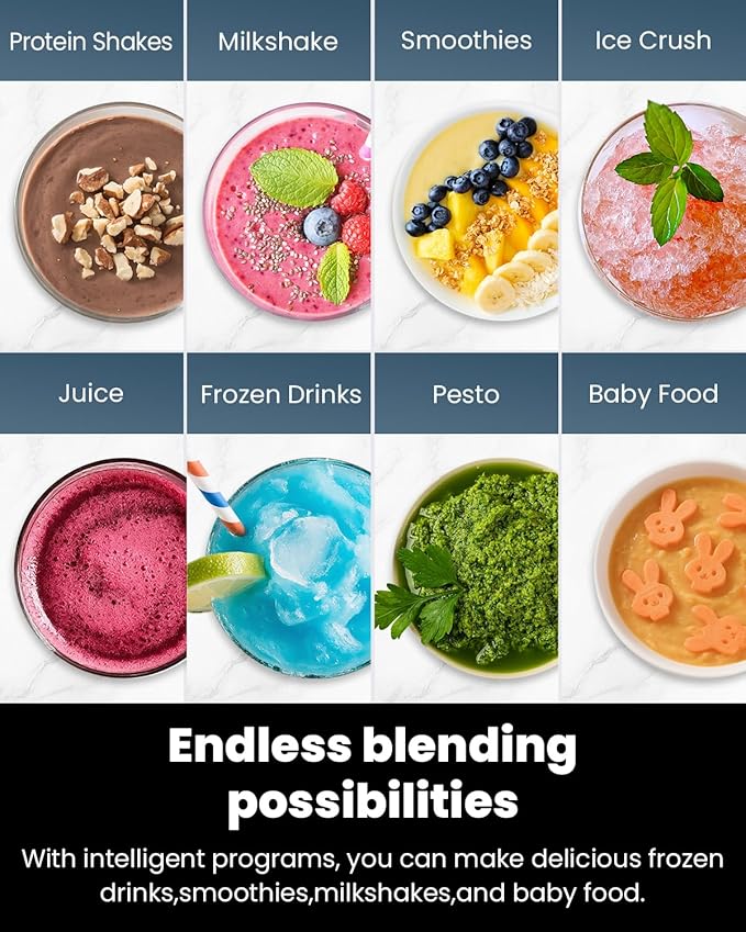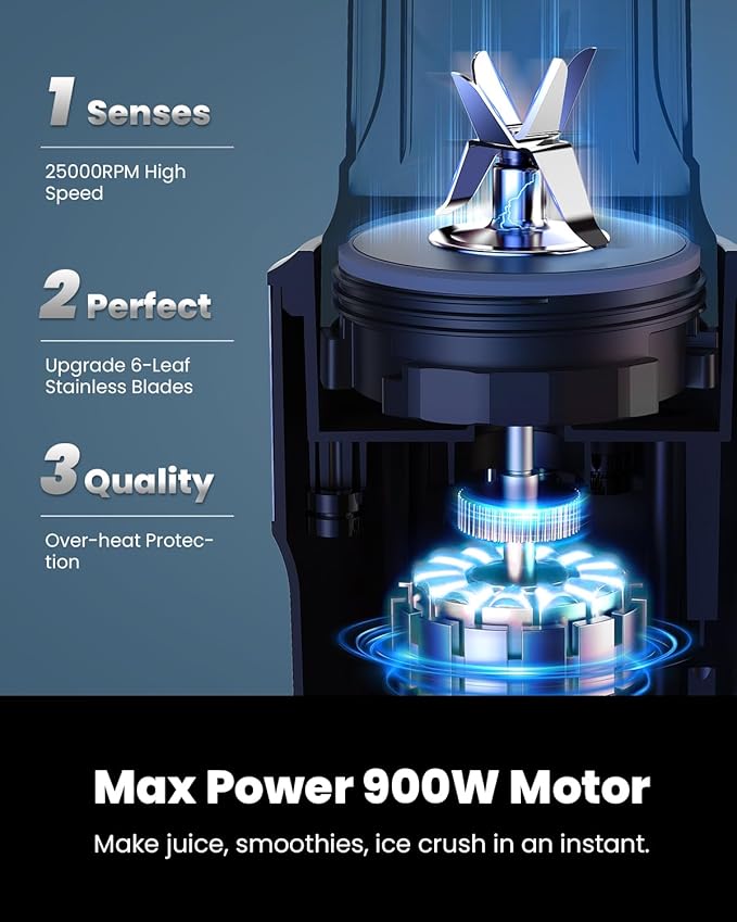 - 【High-Powered 900W Motor】:Equipped with a Max power 900W motor,this smoothie blender reaches speeds of up to 25000RPM for quick and efficient blending. Crush ice cubes and frozen fruits with ease.