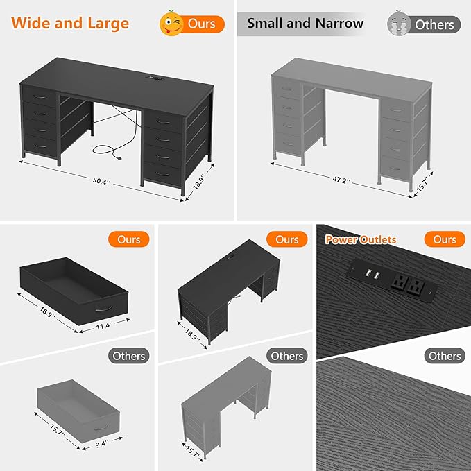 50 Inch Computer Desk with 8 Drawers, Home Office Desk with Power Outlets, Work Study Gaming Desk with 8 Fabric Drawers, Black