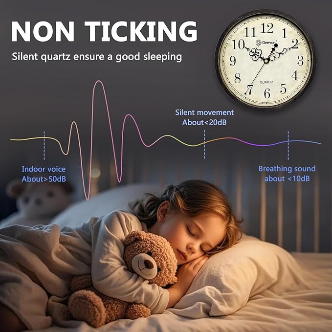 - [Silent & Non-Ticking] The silent wall clock with high-quality quartz movement mechanism ensures precise time. Superior sweeping movement technology provides true silence with the smooth second hand. Allowing you to enjoy a quiet sleep and work environment.