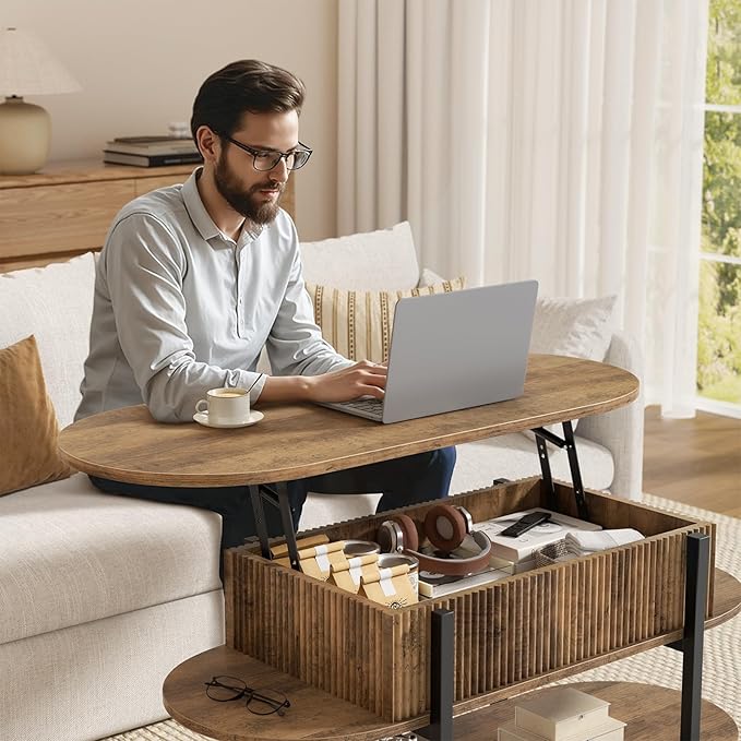 - Lift-Top with Hidden Compartment Storage: The oval lift tabletop effortlessly raises to 25 inches, creating a convenient workspace or dining surface. Beneath the tabletop is a hidden storage compartment, perfect for keeping essentials organized and clutter-free