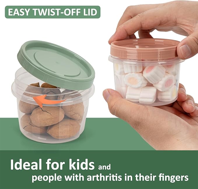 - 【TWIST TOP - USER FRIENDLY】Compared to food storage containers with snap-lock or clamp-style closure, our small storage container comes with twist top design. They are much easier to open and close, ideal for kids, the elderly and those with arthritis or limited hand strength. With 4 vibrant lid colors—yellow, green, red ocher and rock green—you can easily organize and store different foods by color. User-friendly and convenient