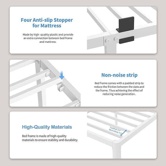 - Noise Free Bed Frame: White metal bed frame is equipped with silent foam, and the queen bed frame adopts a reinforced screw lock structure to ensure that the bed frame will not shake and squeak, ensuring a noiseless sleep