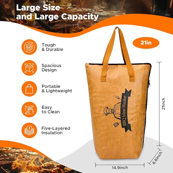 - Perfectly Accommodates Large Meats: Measuring 15” W x 21” H x 7” D, this BBQ blanket is spacious enough to fit large cuts like whole turkeys, pork shoulders, or multiple pieces of meat at once. Whether it’s a BBQ party, picnic, or camping trip, it’s the perfect solution for your grilling needs.