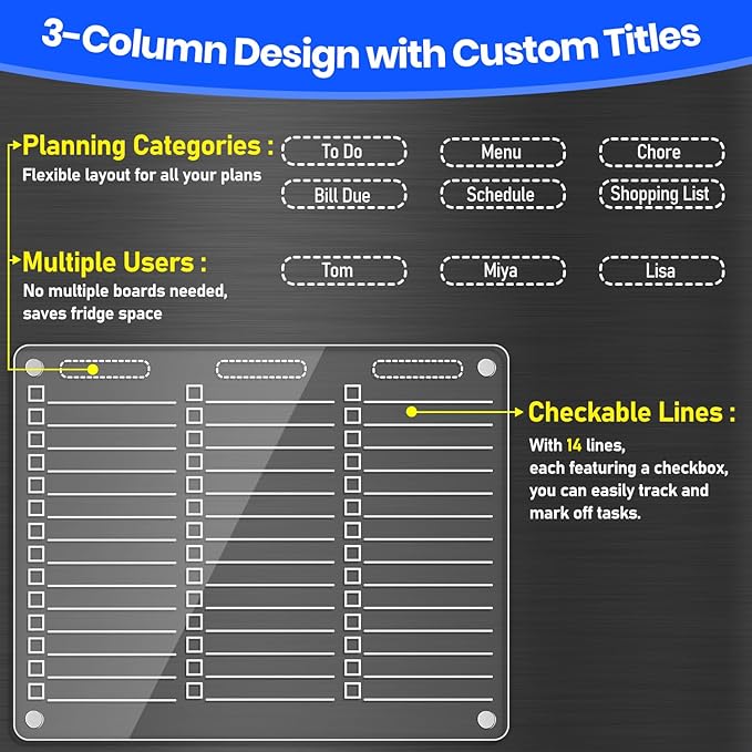 - Versatile 3-Column Design with Customizable Titles — Organize tasks, shopping lists, appointments, chores, menus, or schedules all in one place. Designed for up to three people to independently manage their daily tasks on one board, ideal for busy homes, offices, classrooms, or shared spaces to boost teamwork and stay organized