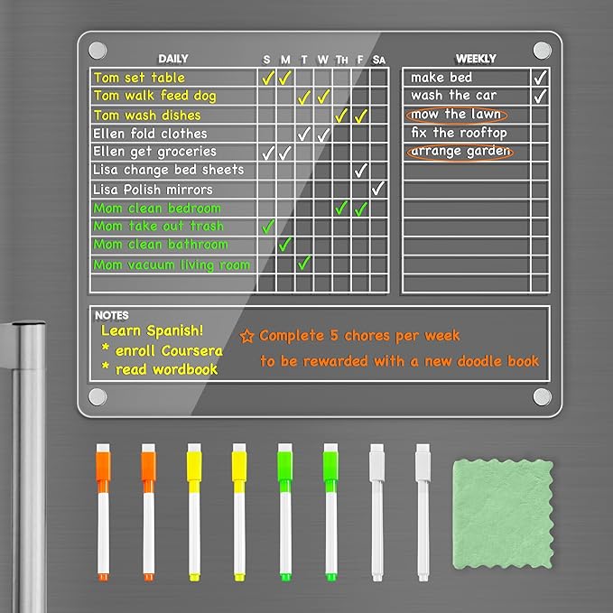 - All-in-One Adult Chore Board — Combines a daily chore chart, weekly checklist, and notes section on one sleek acrylic chore board—perfect for managing tasks, routines, quick memos,upcoming appointments, and reminders all in one place. No more sticky notes cluttering your fridge