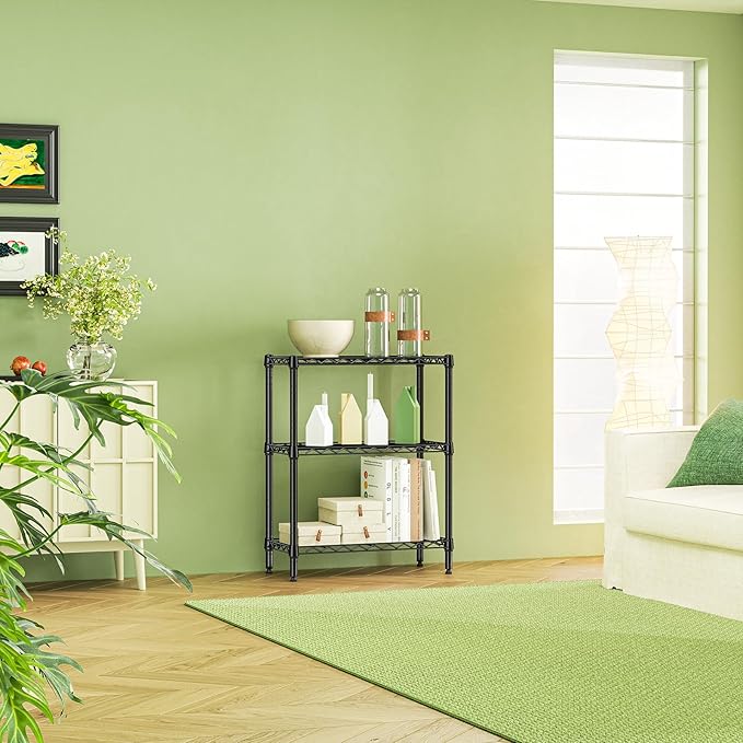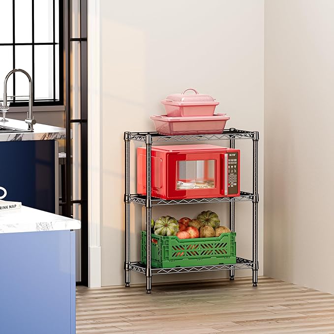 - 【Strong & Stable】Crafted from premium carbon steel, this 3 tier wire shelf offers outstanding strength and durability. With a total load capacity of 750 lbs, it functions perfectly as a pantry floor organizer, bakers rack, or kitchen storage shelf for tools, cookware, and daily essentials.