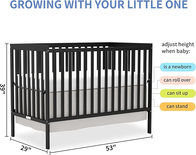 - Grows with Your Baby: Adjustable baby crib with 3 mattress height positions that can be changed according to baby's age. Designed to fit any standard full-size crib & toddler mattress (sold separately)