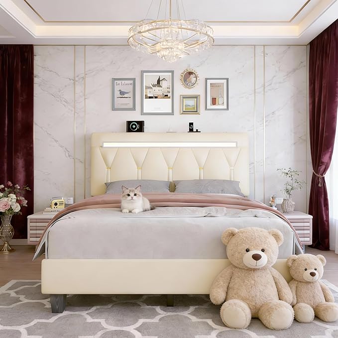 Queen Size Bed Frame with Bluetooth Speaker, LED Lights and Charging Station, Faux Leather Linen Fabric Adjustable Headboard,Modern Upholstered Bed, Wood Slat Support, Beige