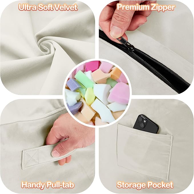 - Removable and Washable Cover: The cover of bean bag chair is removable and washable for further care. It is made of breathable premium dutch velvet with fine texture, soft and skin-friendly from touching. It is also anti-pilling and not easy to fade. You can easily put the beanbag cover into washer to clean it like new. Moreover its double stitched seams and hidden double-pull zipper ensures for super durability & strength