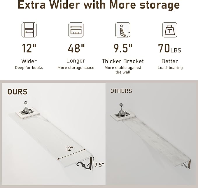 - Large storage space:A home essential for storage and style. Maximize vertical space and add extra multi-layer storage to your walls—without taking up any floor space. A perfect way to declutter and free up your desktops.Dimensions: 48" L × 12" W × 6.1" H