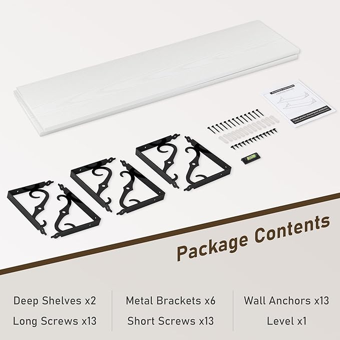 - Timeless Beauty for Every Corner: Transform any wall into a stunning focal point with these spacious wall shelves. Their generous length and width make them perfect for displaying plates, glasses, books, Legos, collectibles, towels, and more. Ideal for adding style and function to your entryway, bathroom, balcony, study, kitchen, laundry room, bar area, or pantry.