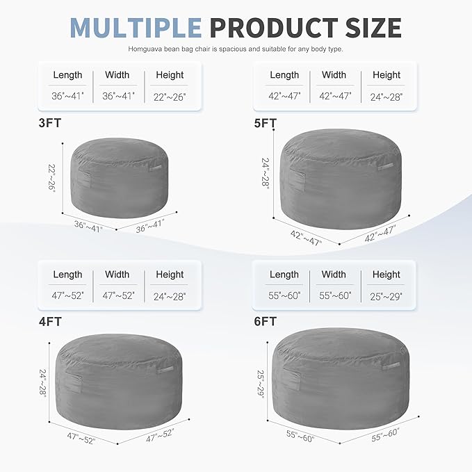 - Memory Foam Filler: Homguava bean bag chair with filling comes with a separate condensed liner package. Once you receive it, please do not leave it for too long and open the package ASAP. After opening, please flip the whole beanbag chair up and roll it a few times, then leave it for about 48 hours, it will expand perfectly.The bean bag is full-filled with memory foams, which has a high resilience, bearing more and increasing the comfort of sitting.