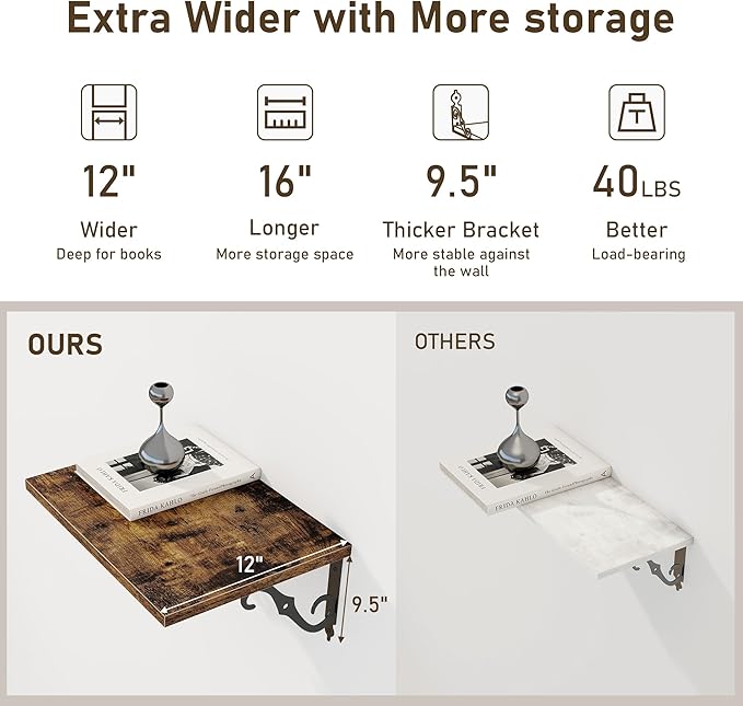 Deep Floating Shelves, 16" W x 12" D Wall Shelves Set of 2, Wide Display Shelf Wall Mounted with Brackets, Bookshelf for Living Room, Bathroom, Bedroom, Rustic Brown