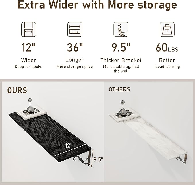 Deep Floating Shelves, 36" W x 12" D Wall Shelves Set of 2, Wide Display Shelf Wall Mounted with Brackets, Bookshelf for Living Room, Bathroom, Bedroom, Black