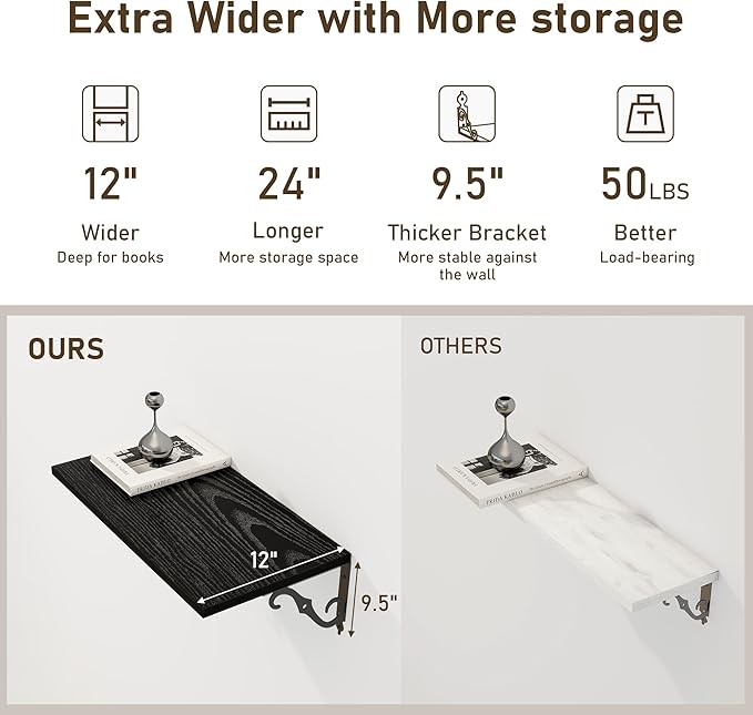Deep Floating Shelves, 24" W x 12" D Wall Shelves Set of 2, Wide Display Shelf Wall Mounted with Brackets, Bookshelf for Living Room, Bathroom, Bedroom, Black