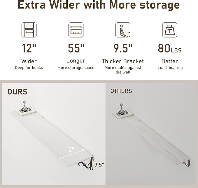 Deep Floating Shelves, 55" W x 12" D Wall Shelves Set of 2, Wide Display Shelf Wall Mounted with Brackets, Bookshelf for Living Room, Bathroom, Bedroom, White