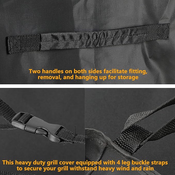 - Excellent Design: This heavy duty grill cover equipped with 4 leg buckle straps to secure your grill withstand heavy wind and rain; two handles on both sides facilitate fitting, removal, and hanging up for storage