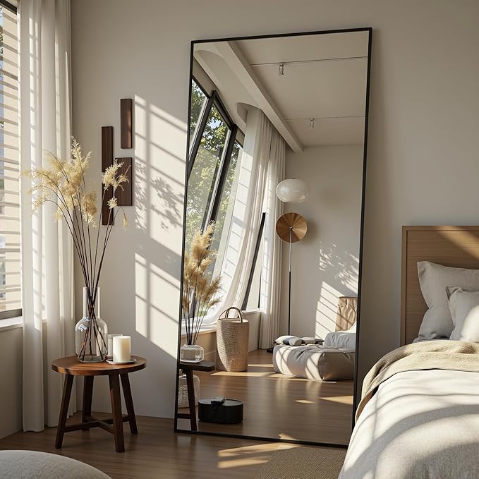 - Mirror Full Length: This full-length mirror measures 71 inches in length x 32 inches in width, which not only provides you with enough coverage to check your outfit from head to toe, but also ensures a multi-angle display to create an illusion of more space
