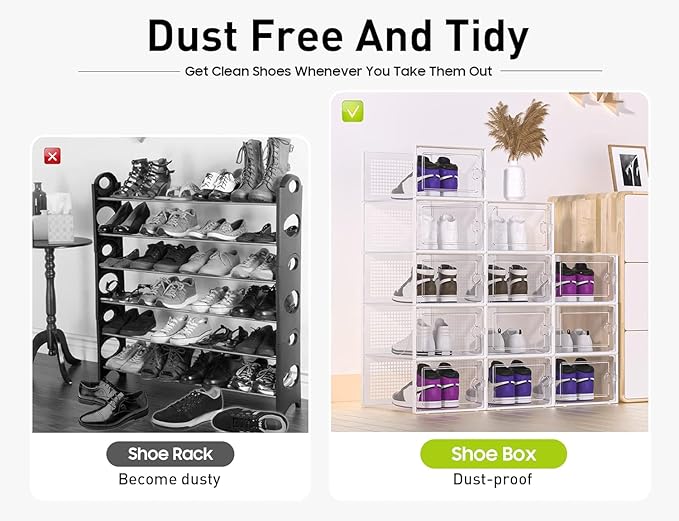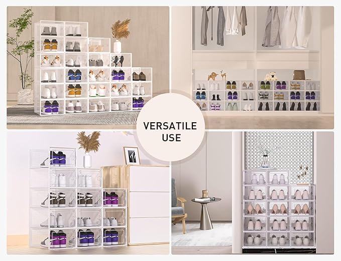 Kuject XX-Large Shoe Storage Boxes Organizers Clear Plastic Stackable 12 Pack, Shoe Rack & Holder Substitute, Sneaker Containers, Toy Storage Organizer Bins for Entryway, Closet, Under Bed, White