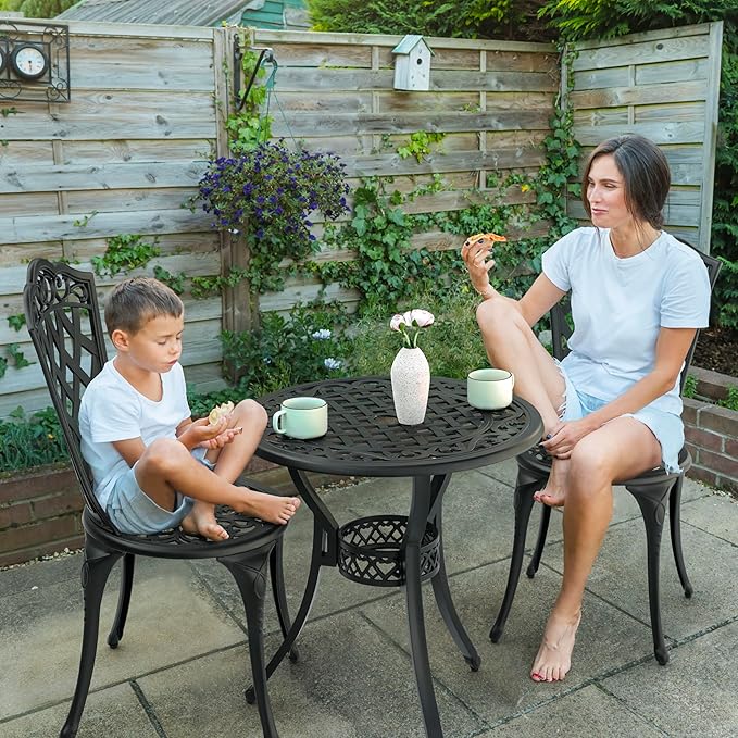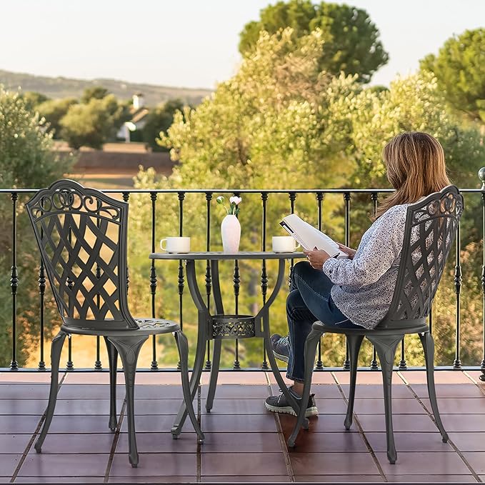 - Cast Aluminum Material: Crafted from cast aluminum, this outdoor bistro set offers exceptional durability and resistance to rust, making it perfect for long-term outdoor use. Its lightweight design allows for easy movement and rearrangement.