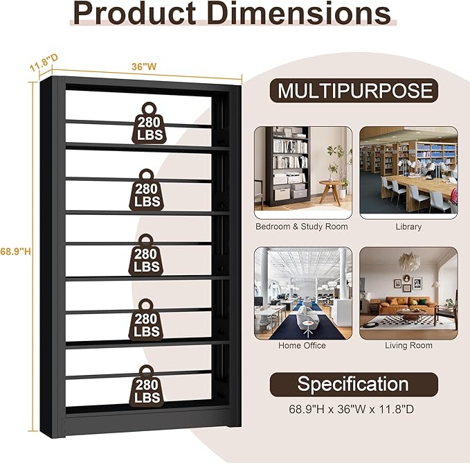 - 【Large Size】Size: H68.9*W36*D11.8 inch.Taller and wider black bookcase.There are adjustable bookends on the back to stop the books from falling.This steel bookshelf is ideal for storing more than just books. You can use it to display family photos, plants, decorations, and even electronics to improve space utilization. Whether it is study, living room, office, or workplace, it can be adapted to meet your different storage needs