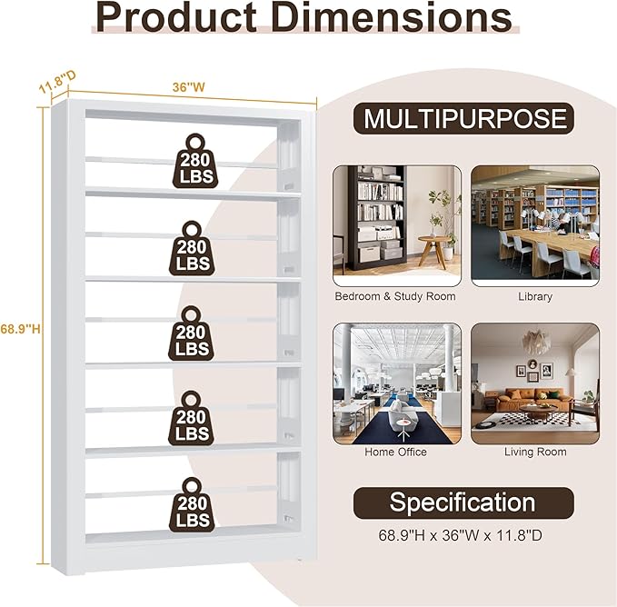- 【Large Load-bearing Metal Bookshelf】Our bookshelf is made of metal and can hold up to 280 pounds per shelf.The MORE things you put on the shelf, the MORE STABLE it becomes!! The steel bookshelf is heavier than the wooden bookshelf and have no smell or pollution. Moving disassembly is not easy to damage.Longer service life than wood bookshelves.Steel bookshelves can last for decades