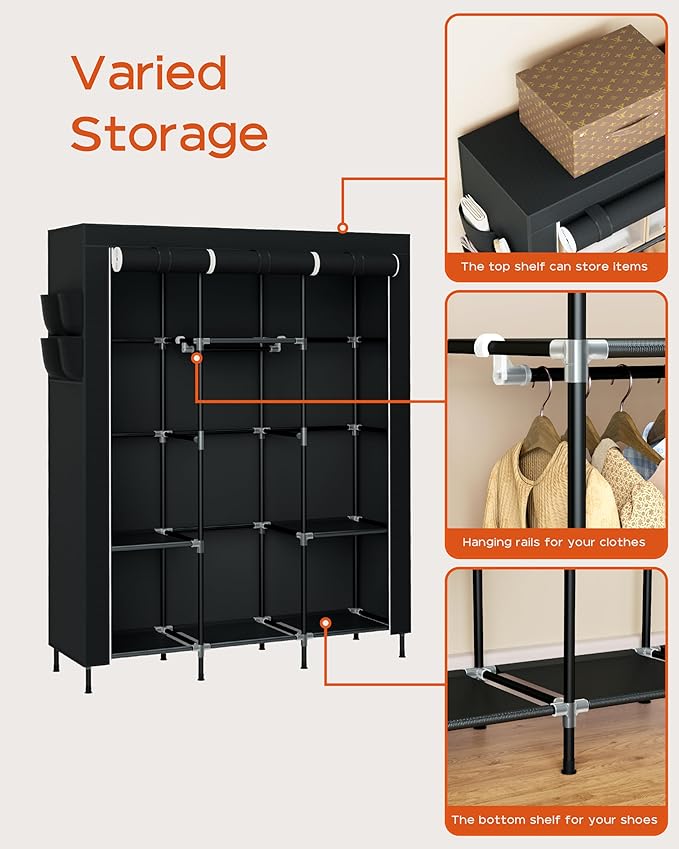 - [Stable and Strong] Featuring with steel tubing, high quality non-woven fabric and durable connectors, this wardrobe ensures long-lasting stability and support. Each hanging rod holds 33 lb and Each shelf holds up to 11 lb.