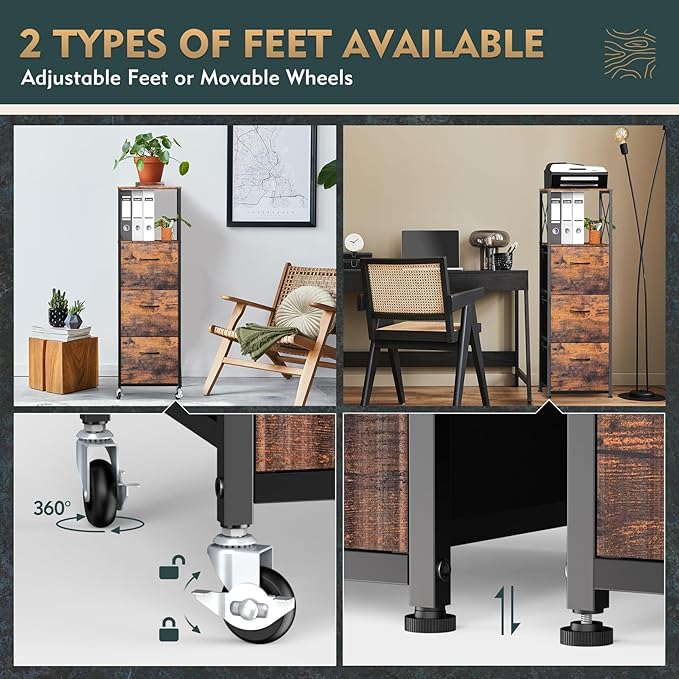 - Mobility and Stability: Whether you work in a fixed location or move frequently, Vestibk Filing Cabinets for Home Office adapt to your needs. Two replaceable legs and 360° swivel wheels make it easy to navigate your home. Equipped with brakes, the file cabinet for home office stays firmly in place when needed. Adjustable feet ensure a smooth experience on any floor, keeping your files secure and organized.