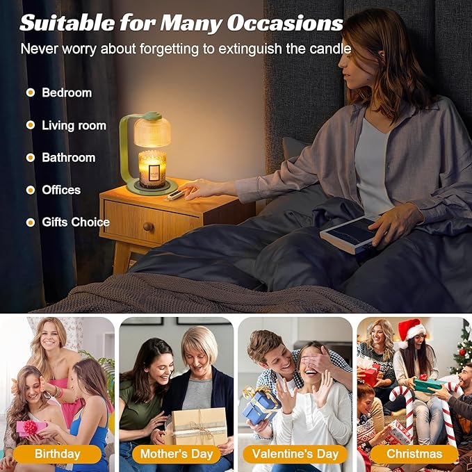 - Smart Timer Function - Never worry about leaving your candle warmer on again! With our innovative timer function, you can easily set the lamp for 2, 4, or 8 hours. This thoughtful feature lets you enjoy your favorite scents without the stress of remembering to turn it off, providing peace of mind while you sleep or go about your day. Itβs a safer, more economical alternative to traditional candles, allowing you to focus on what truly matters.4.