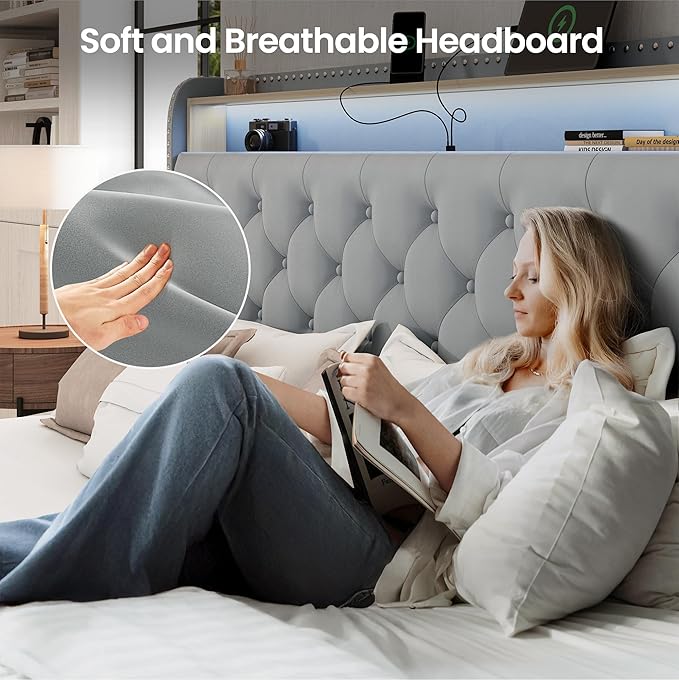 - [Sleek Led lighting]: The tufted bed frame builds LED lights in the headboard. Then it could creat a relaxing and ambient atmosphere in your bedroom