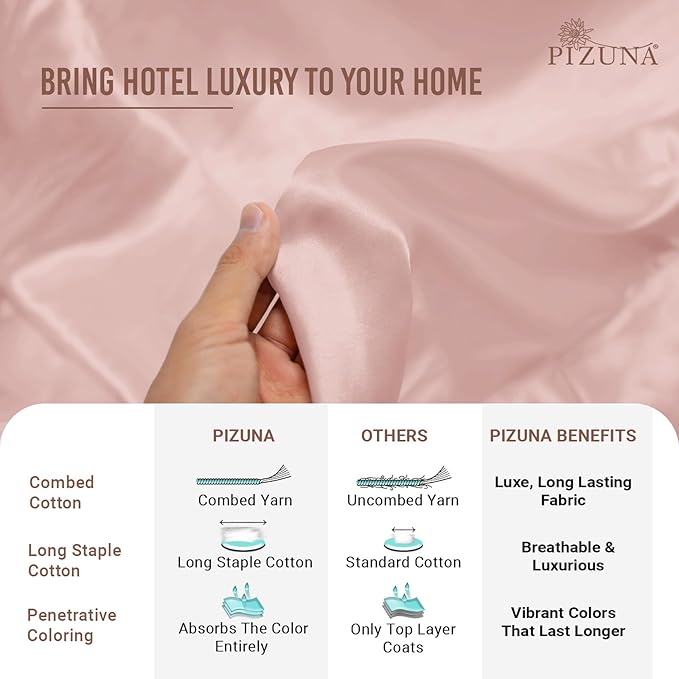 - 100% Pure & Natural Mercerised Combed Cotton: With Pizuna's fine yarn technique, this authentic 400 Thread Count combed cotton duvet cover and fitted sheet set features a single dent (4 up-1 down) sateen weave. Usage of mercerised combed cotton make this set smooth & strong. Pure & natural cotton bedding wrinkles, but it is distinctively cooler & breathable. Further, it softens and the wrinkling reduces with every wash.
